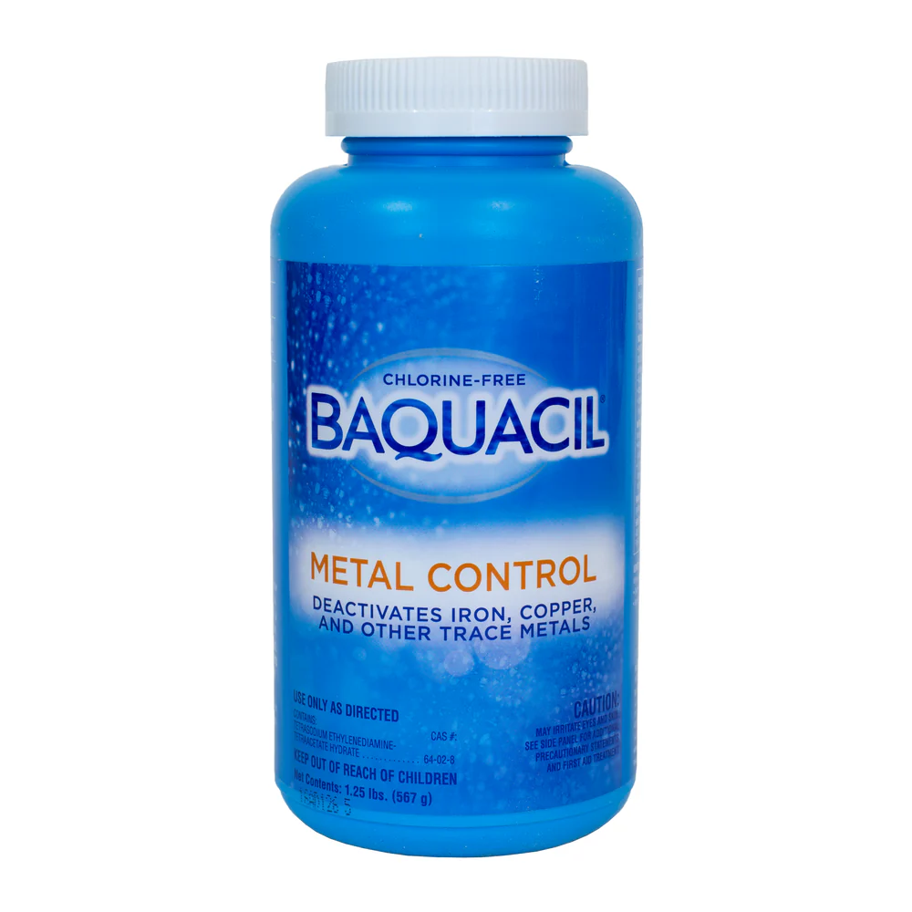 - Add one container (1 1/4 lb) of Baquacil Metal Control per 10,000 gallons of pool water to control up to 2 ppm of total metals present (for example, from copper and 1 ppm iron)