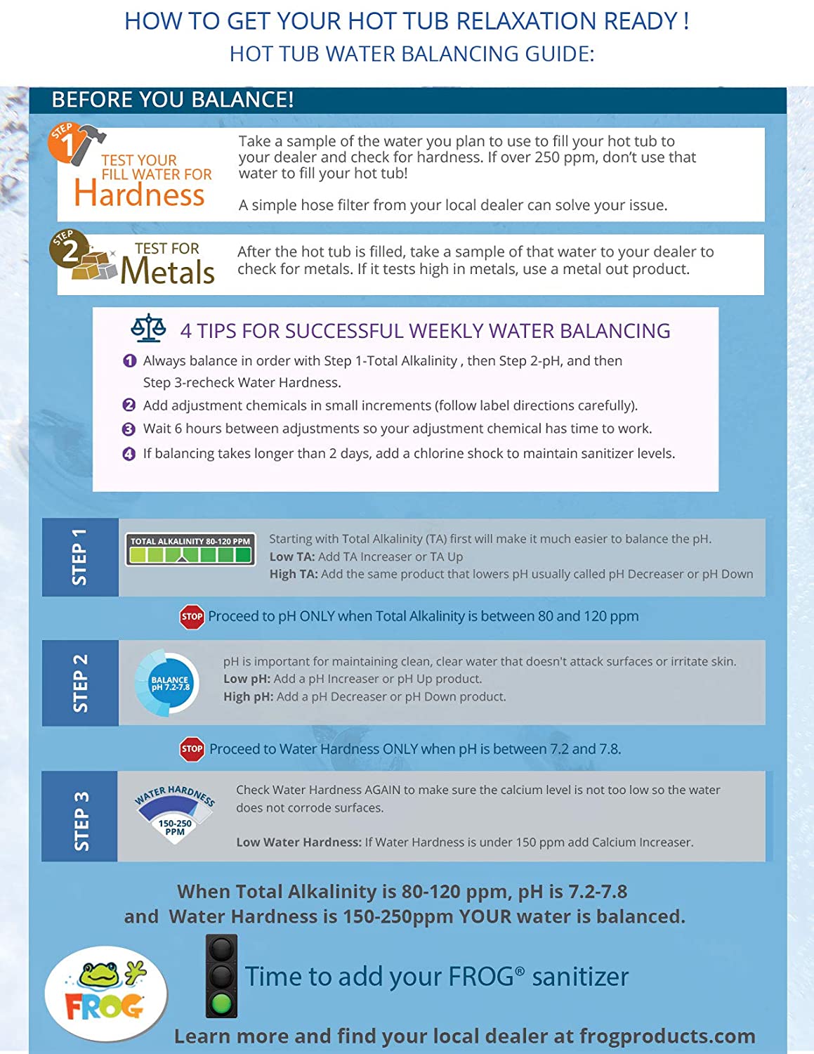 Balance the water in accordance to the water balancing guidelines with the pH between 7.2-7.6 and total alkalinity levels at 800-120 ppm. Calcium levels are also required to be 200-400 ppm. Establish a free chlorine residual of .5 – 1.0 ppm in the hot tub with Frog Jump Start start up shock or an EPA approved hot tub chlorine shock following the directions for that product. When using other products as outlined in directions always follow directions on those products.