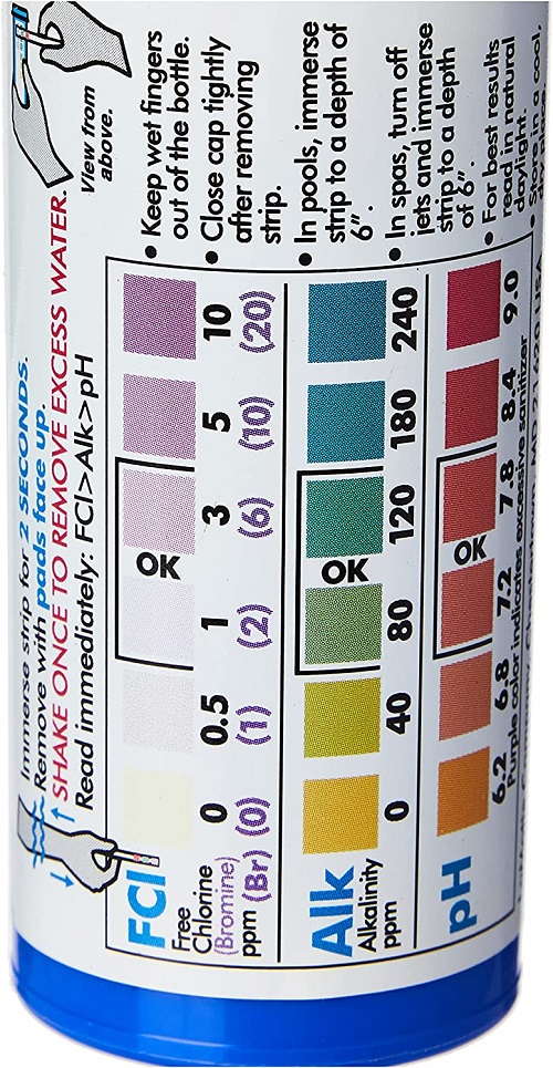 - Measures free chlorine 0-10 ppm (or bromine 0-20 ppm) pH 6.2-8.4 and total alkalinity 0-240 ppm