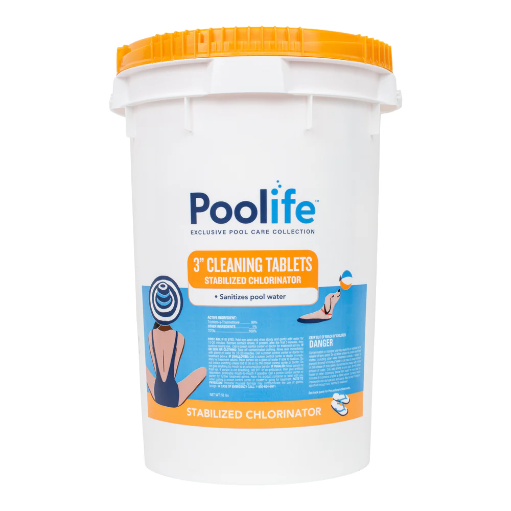 Poolife Exclusive Pool Care Collection 3” Cleaning Tablets Stabilized Chlorine are formulated to protect against chlorine loss in direct sunlight and can be used in floaters feeders or skimmers. These convenient and easy to use tablets are designed to dissolve slowly providing a steady source of available chorine for complete swimming enjoyment in your pool. Tablets contain cyanuric acid to protect the chorine from sunlight degradation. Available in 25lbs and 50lbs.