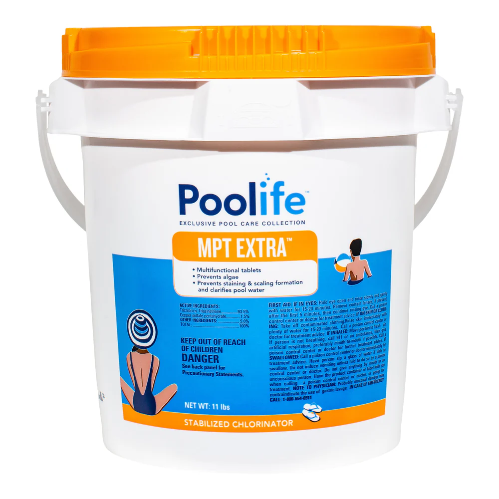 Poolife Exclusive Pool Care Collection MPT Tablet Stabilized Chlorine It’s a convenient, easy to use and effective approach to pool care. POOLIFE Multipurpose Tablets were developed using new all-in-one technology to provide continuous chlorination, clarify pool water and prevent algae growth. The patented formula prevents algae growth for up to 8 days longer than regular 3″ Tri chlor Chlorine tablets.