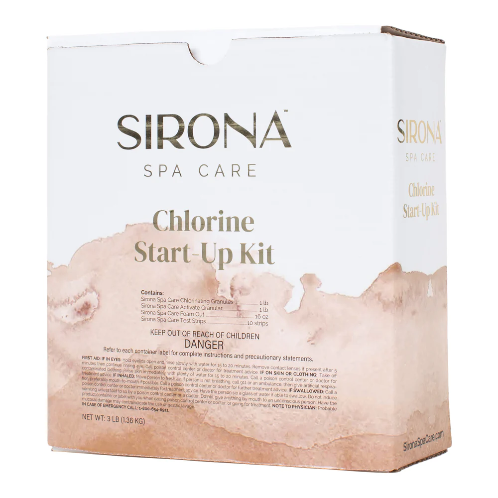 Sirona Spa Care Chlorine Start-Up Kit is an easy to use spa kit that contains the essential products for chlorine maintenance of water in new or freshly filled spas. This kit takes the guesswork out of determining what products work together to ensure the spa is properly sanitized and safe for bathers to enjoy. Simplify your spa needs by using this kit to maintain your spas chlorine level.