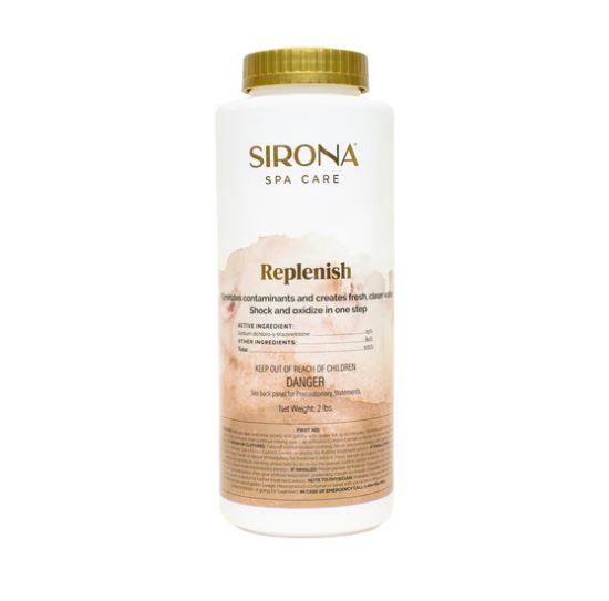 The Sirona Spa Care Replenish is a granular shock oxidizer that will help create fresh and clean water by eliminating contaminants from the spa. This product will help regenerate active bromine when used in conjunction with a bromine sanitizer by oxidizing inert bromide salt to activate the sanitizer. Make sure to test bromine residual regularly to maintain a level between 3 – 5 ppm to ensure safe swimming conditions.