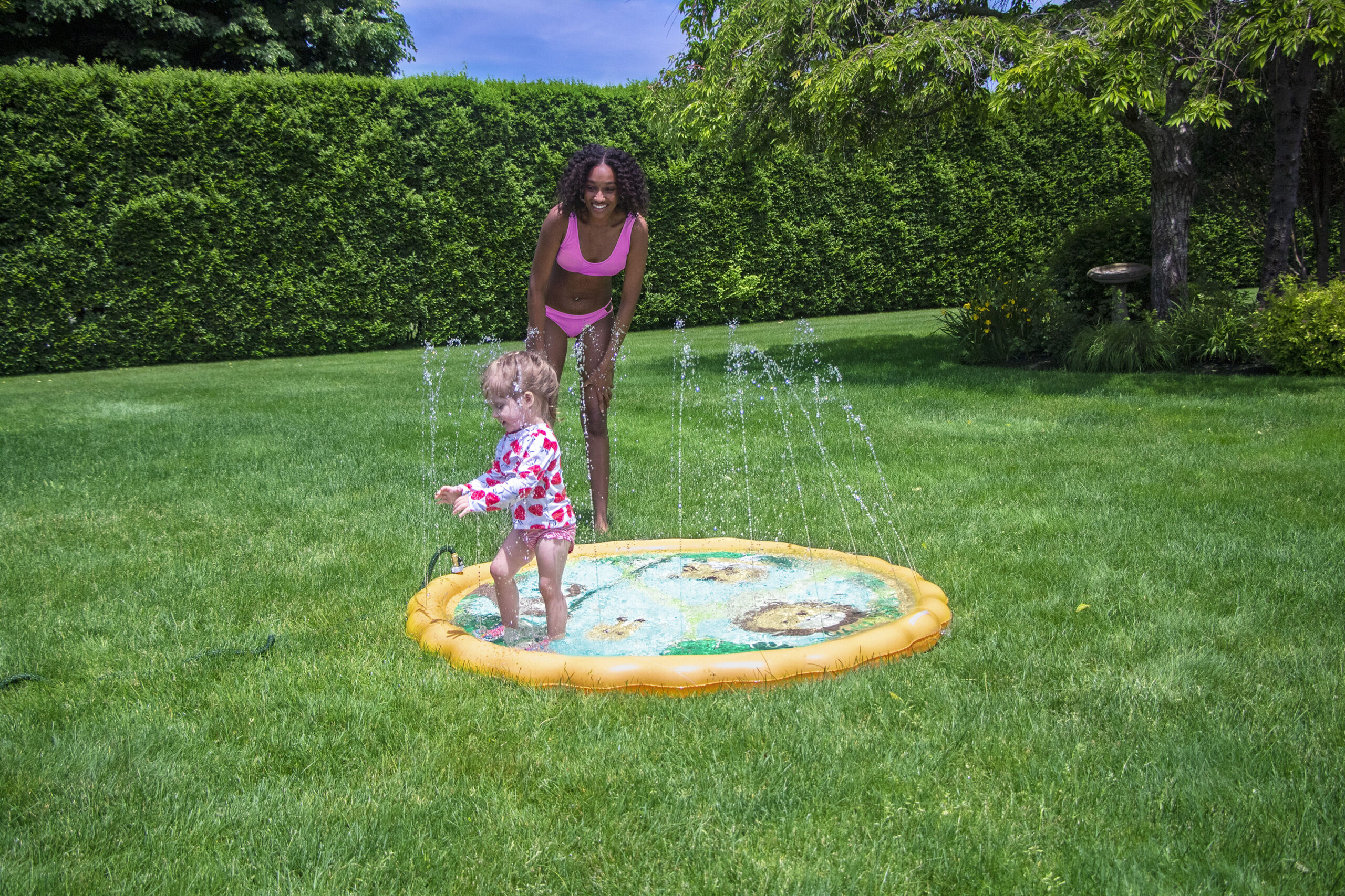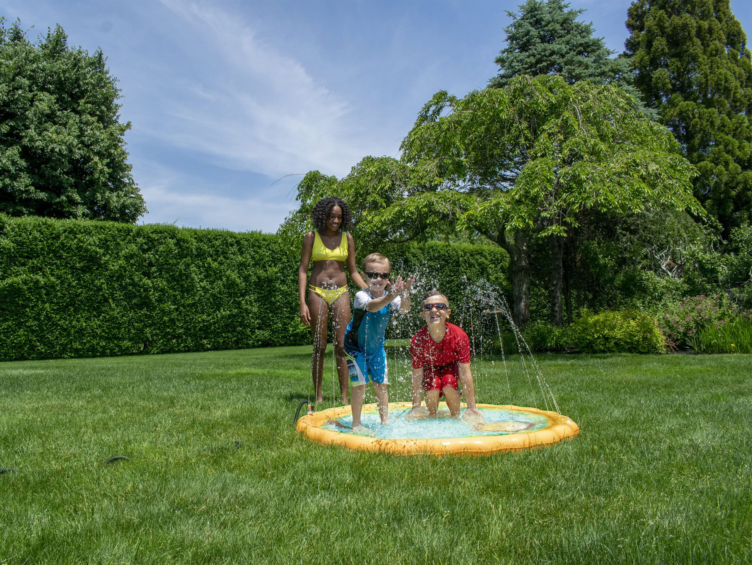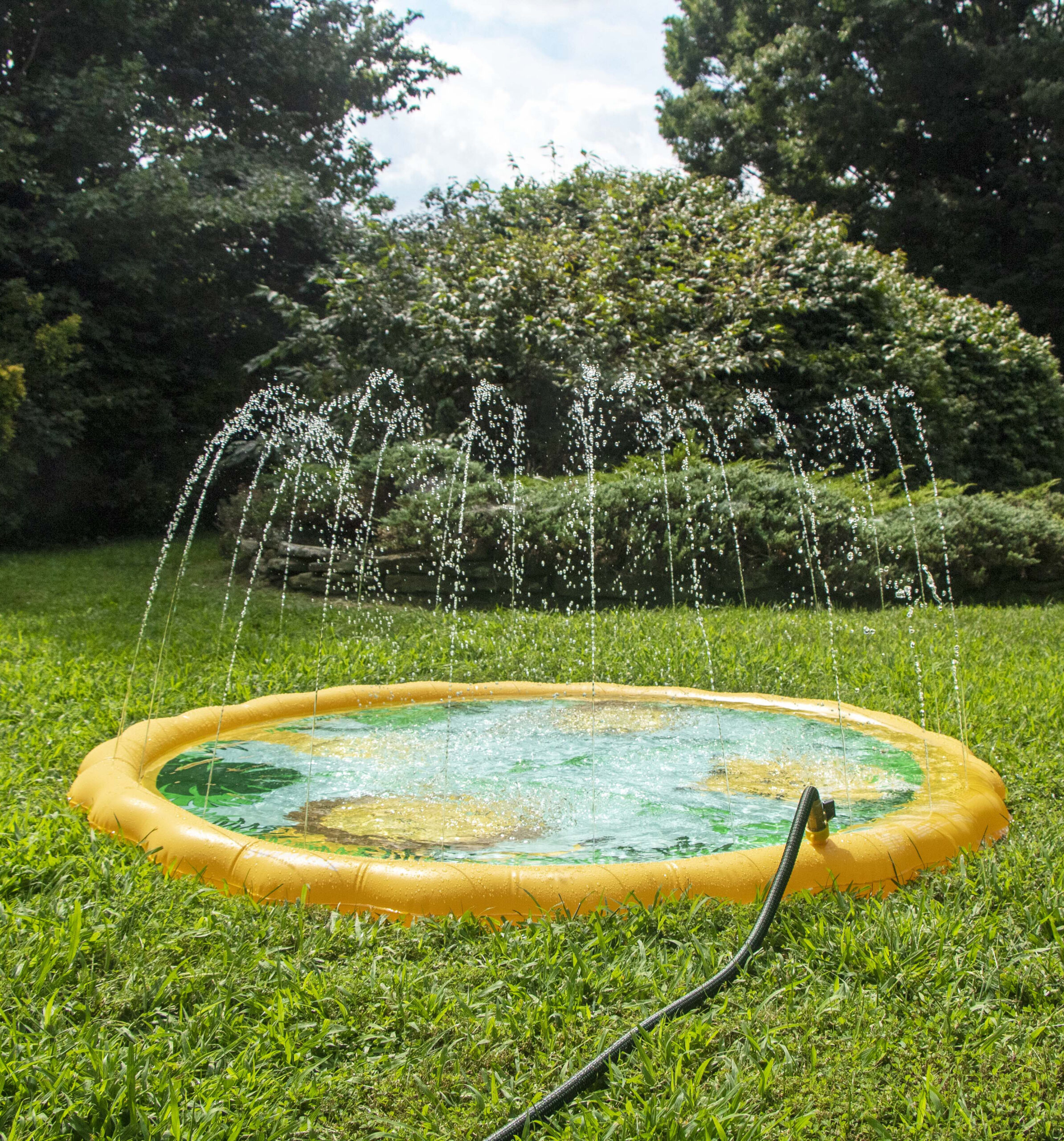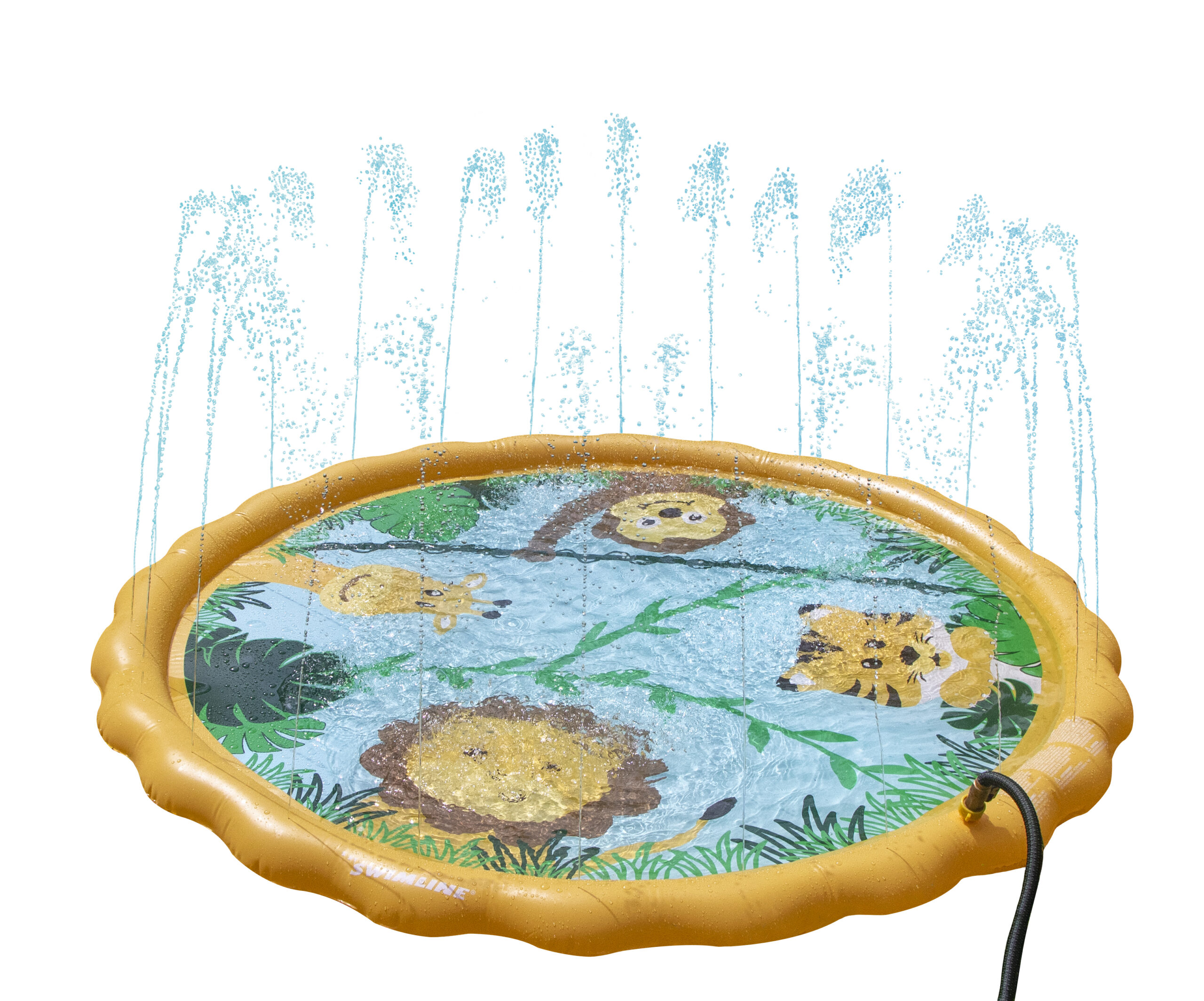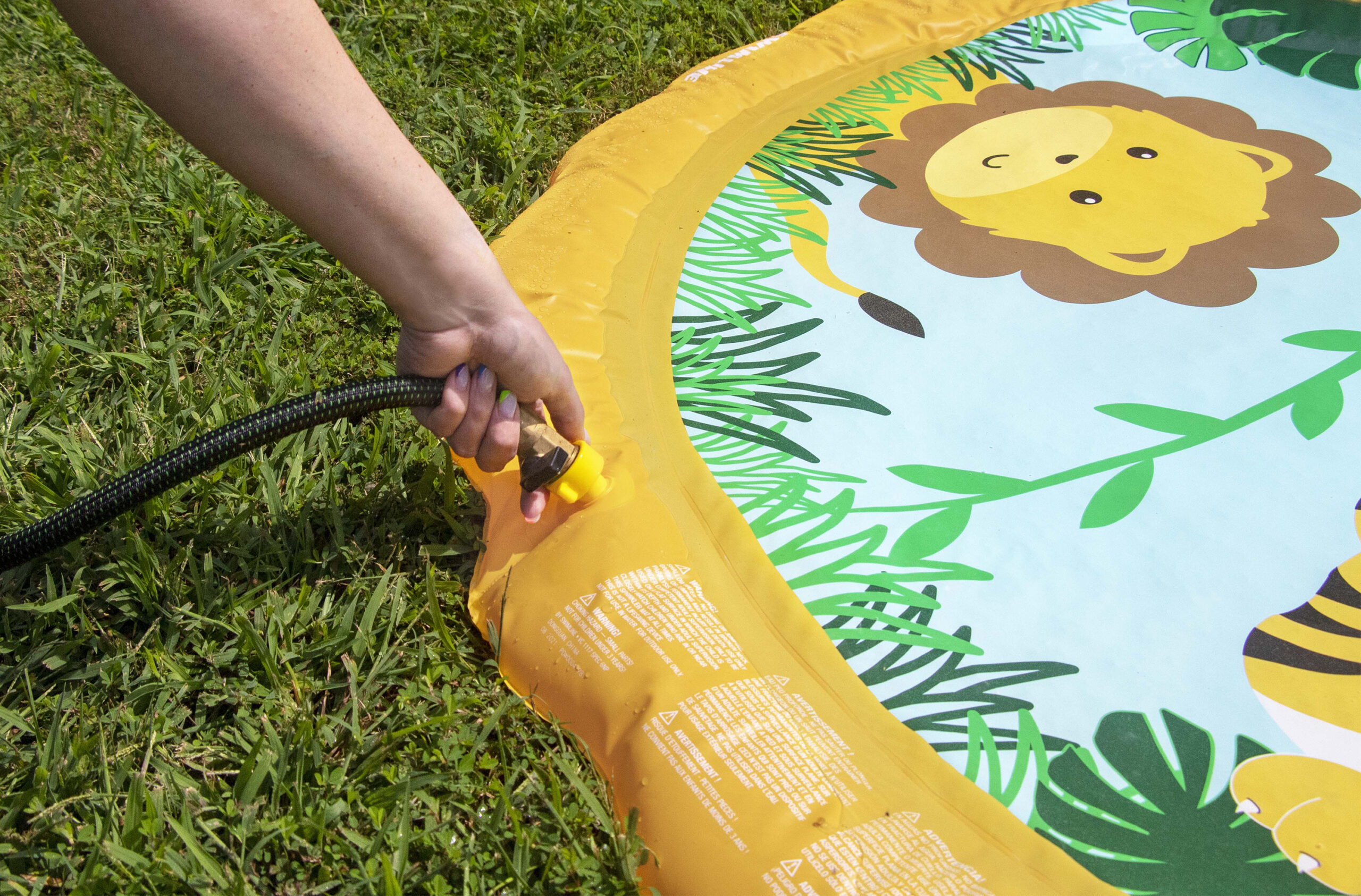The Swimline Safari Sprinkler Mat is a fun, kid-friendly outdoor water play mat designed to provide refreshing entertainment during warm weather. Featuring a colorful safari-themed design and an integrated sprinkler system, this mat creates a playful splash zone that keeps kids active, cool, and engaged. Ideal for backyards, lawns, and outdoor play areas, the Safari Sprinkler Mat offers a simple way to turn a standard garden hose into an exciting water attraction without the setup or space requirements of a pool. The Safari Sprinkler Mat connects directly to a standard garden hose, sending water through the perimeter to create gentle upward spray patterns across the mat. This sprinkler effect encourages kids to run, jump, and play while staying cool under the water spray. The evenly distributed spray helps provide consistent coverage across the mat, making it suitable for group play and shared use. The bright safari animal graphics add visual excitement and help create a playful outdoor environment. The themed design makes the mat more engaging for children, encouraging imaginative play while keeping them active and entertained.This design makes the mat a popular choice for families, playdates, and summer gatherings.The mat is designed to provide a smooth, comfortable surface for barefoot play. Water flowing across the surface helps reduce heat buildup, making it comfortable for kids to sit, crawl, or run on during playtime. Its low-profile design keeps play close to the ground, offering a safe alternative to deeper water activities when used with supervision. The Swimline Safari Sprinkler Mat is designed for quick setup with no tools required. Simply connect it to a standard garden hose, adjust water pressure as needed, and it’s ready for use. When playtime is over, the mat drains easily and can be deflated for compact storage, making it convenient for repeated seasonal use. This sprinkler mat is best suited for flat outdoor surfaces such as grass, patios, or play areas. It provides a simple, accessible water play option for families who want to keep kids cool without installing permanent water features.