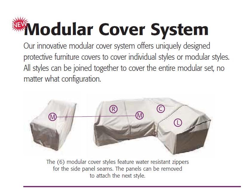 The innovative modular cover system offers uniquely designed protective furniture covers to cover individual styles or modular styles. All styles can be joined together to cover the entire modular set, no matter what configuration. The panels can be removed to attach to the next style and zipper together to create one complete unit.